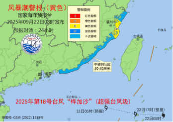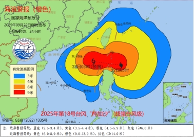 海浪方面,受今年第18号台风“桦加沙”(超强台风级)的影响,预计9月22日下午到23日下午,巴士海峡、南海东北部将出现8到13米的狂浪到狂涛区,台湾海峡将出现4到6米的巨浪到狂浪区,近海海域海浪预警级别为橙色;广东东部近岸海域将出现3.5到5.5米的大浪到巨浪,该近岸海域海浪预警级别为橙色,福建南部近岸海域将出现2.5到4米的大浪到巨浪,该近岸海域海浪预警级别为黄色,福建北部、浙江南部近岸海域将出现2到3米的中浪到大浪,该近岸海域海浪预警级别为蓝色。请在上述海域作业的船只注意安全,沿海各有关单位提前采取防浪避浪措施。