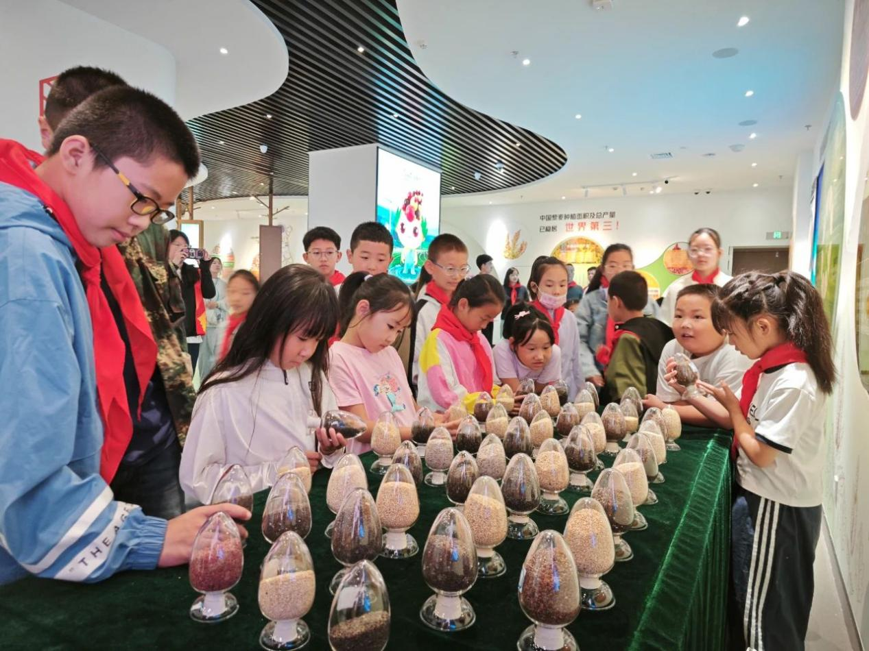 而在“中国藜麦第一县”的特色地标 —— 藜麦馆,另一种惊喜正在上演:饱满的藜麦穗子如彩色铃铛般悬挂,红似玛瑙、黄如琥珀,展板上详细记录着藜麦从高原引种到规模化种植的艰辛历程,讲解员还带着孩子们触摸藜麦种子、通过放大镜观察细节,观看藜麦清洗、加工、制成美食的全过程。“原来我们吃的藜麦饼干,要经过这么多步骤!”学生们的感慨,正是劳动精神与珍惜粮食理念的生动传递。