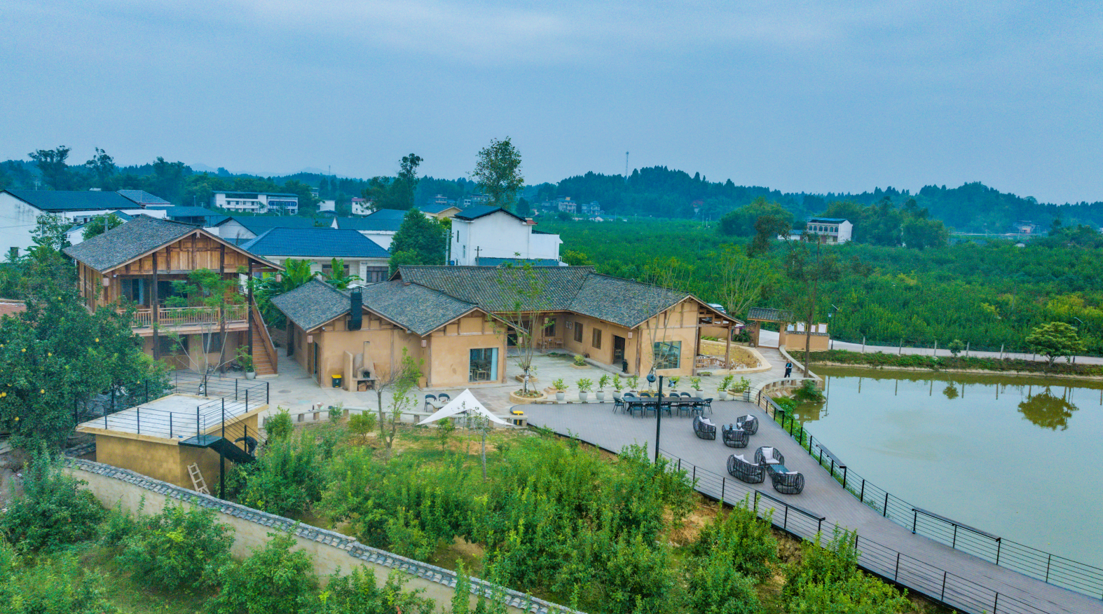 柠檬书院占地约4000平方米,坐落在青山绿水之间。进入书院,首先映入眼帘的是那座传统的乡土建筑,木质结构与石板地面相得益彰,仿佛带领游客穿越时光,回到那个宁静而质朴的年代。院内的布局别具匠心,以“一院、一水、一园”的形式展现了其独特的魅力。书院内的高端客房简约而雅致,配备了现代化设施,为游客提供了一个既舒适又充满乡村气息的住宿环境。