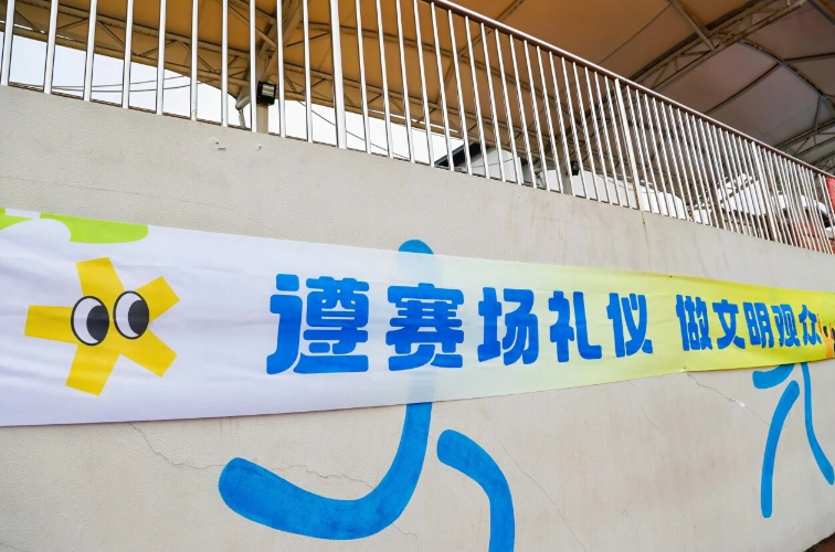 在赛场中,文明观赛横幅如纽带般串联起赛场的各个角落,路边指引牌化身“文明守护者”。“场上比竞技 场下赛文明”“遵赛场礼仪 做文明观众”等标语以简洁有力的语言,既为观众指明方向,又以春风化雨的方式传递文明观赛的核心要义,让文明观赛的理念从“入眼”到“入心”。