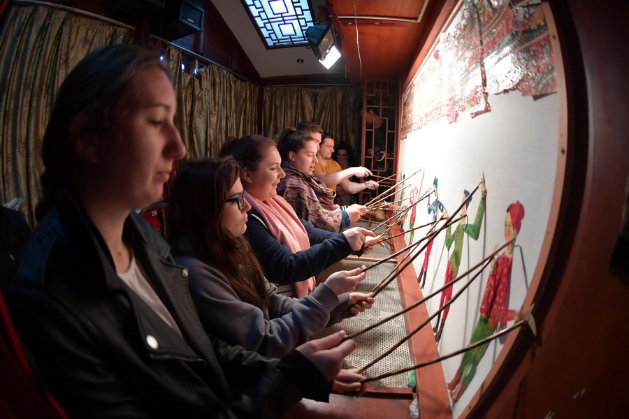 外国友人在阆中古城体验非遗项目。王皮影 摄