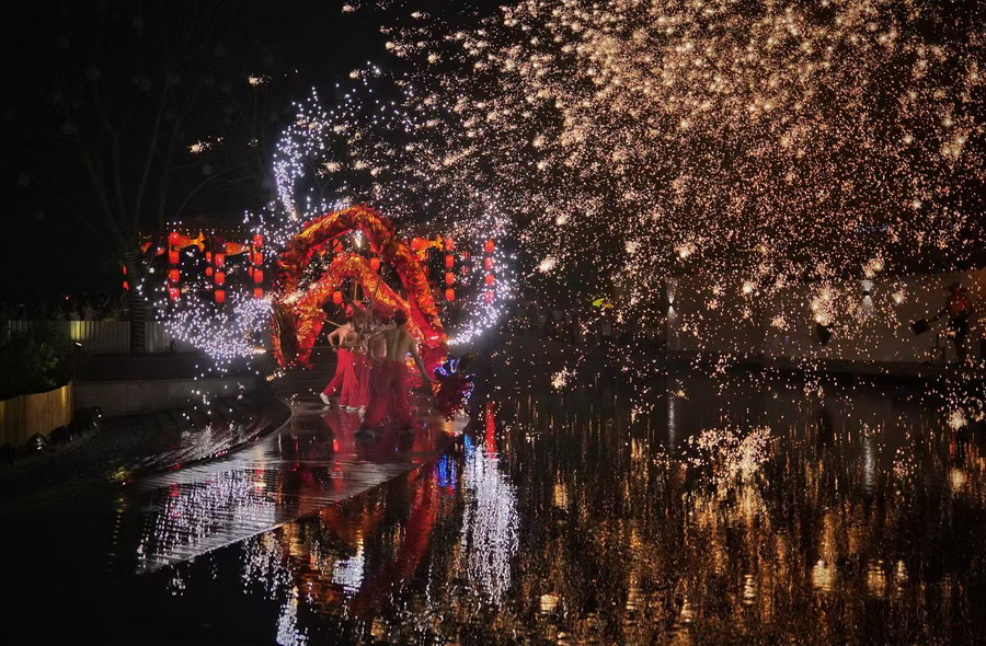 成都青羊区清源社区舞龙、打铁花表演。成都市文明办供图