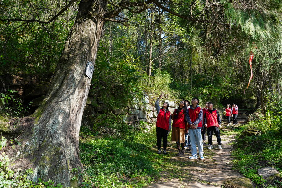 “大蜀道·蜀小兵”志愿服务队志愿者监测古柏生长情况。中共剑阁县委宣传部供图