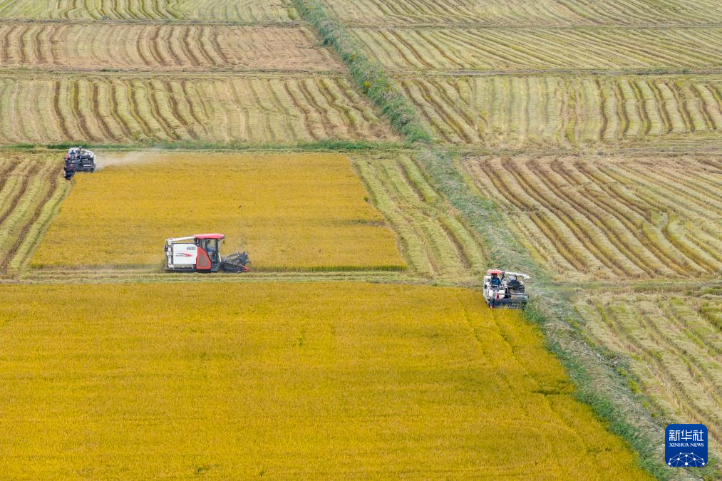10月22日,农民在河南省信阳市光山县罗陈乡张楼村抢收水稻。