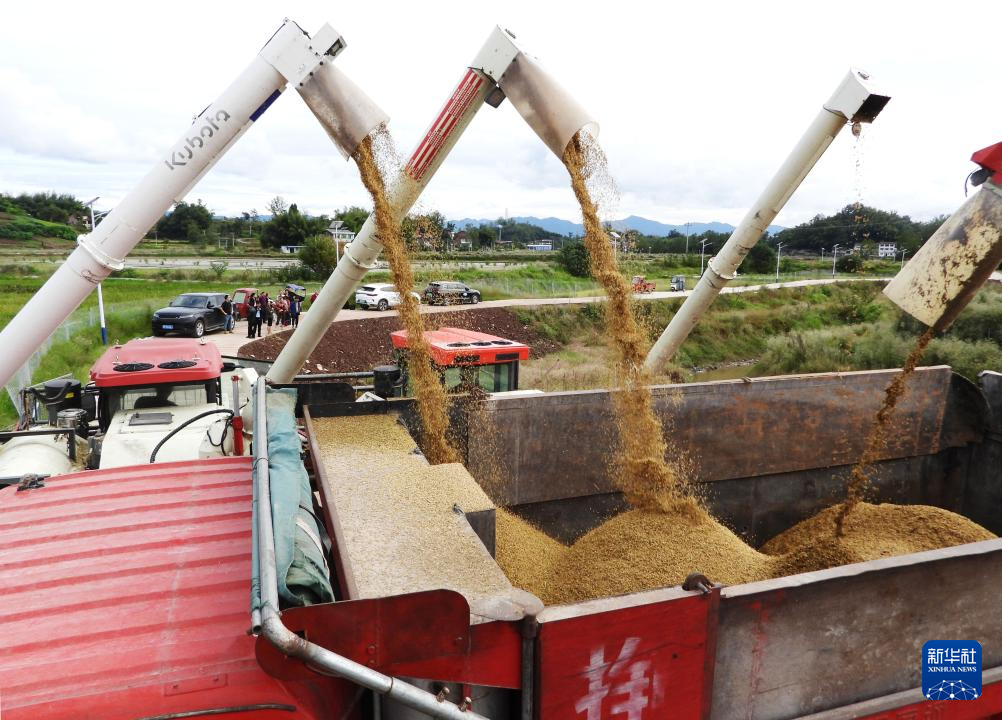 10月22日,在四川省达州市大竹县石桥铺镇长青村的稻田间,农机手将收获的水稻装入运粮车。