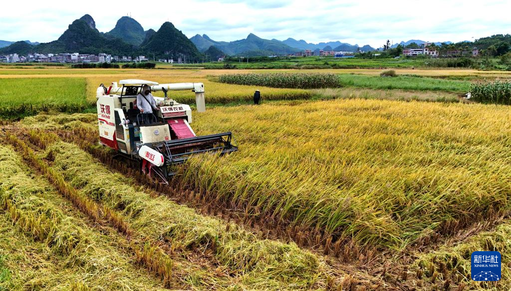 10月22日,在广西来宾市忻城县城关镇都乐村,农民驾驶收割机抢收晚稻(无人机照片)。