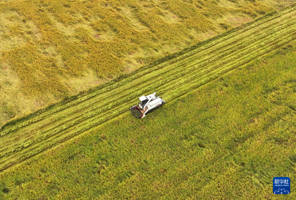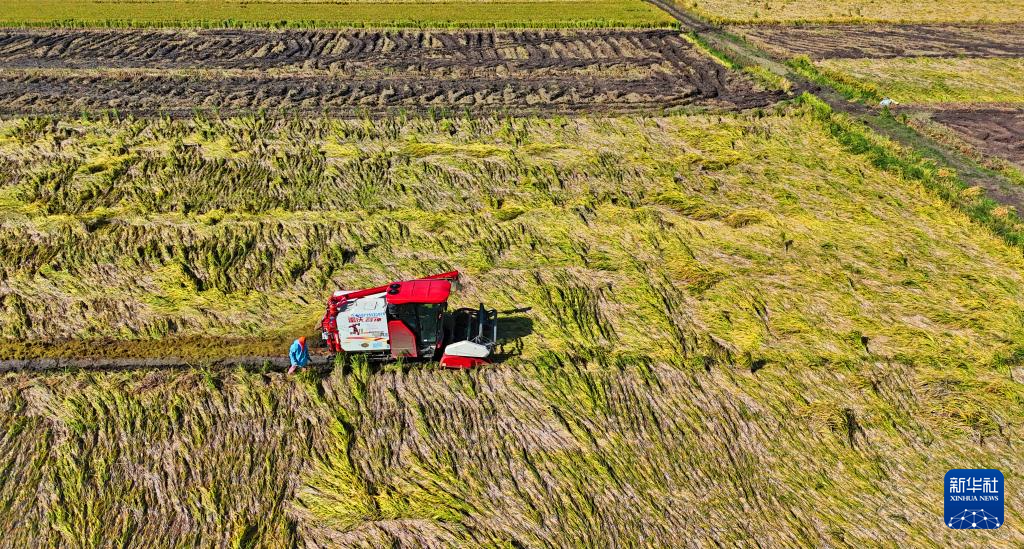 10月22日,在浙江省嘉兴市南湖区凤桥镇星火村,农机手驾驶收割机收割水稻。