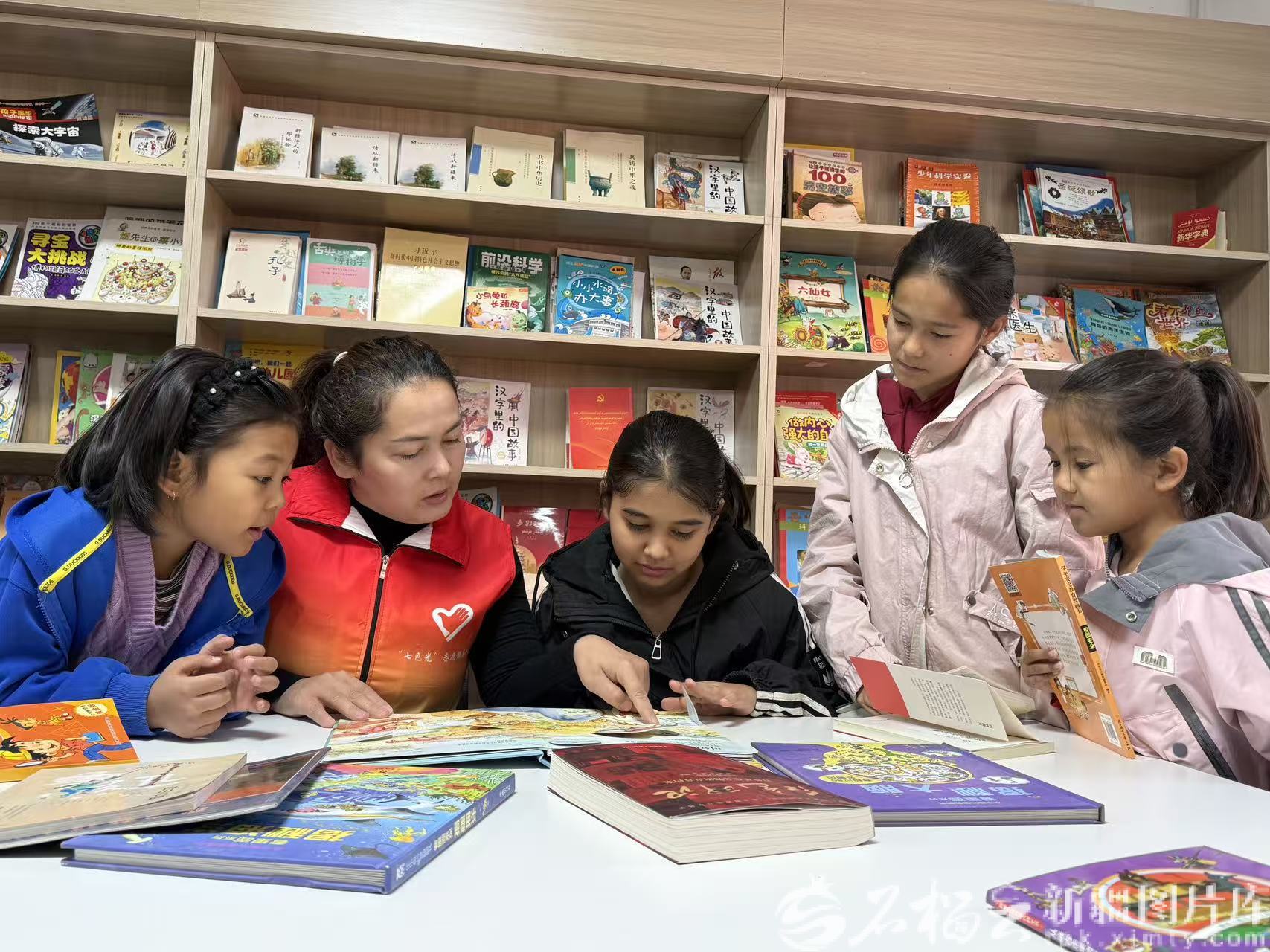 10月18日,育才路社区“七色光”志愿服务队的志愿者米克热班·然木(左二)带领孩子们一起读书。天山网-新疆日报记者 白素君摄