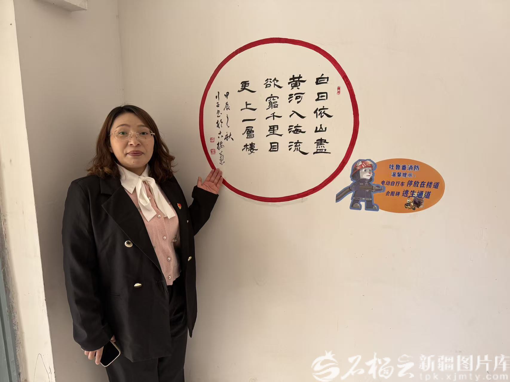 10月18日,育才路社区干部米克热古丽·沙德克向记者介绍二号小区单元楼道里的文化墙彩绘作品。天山网-新疆日报记者 白素君摄