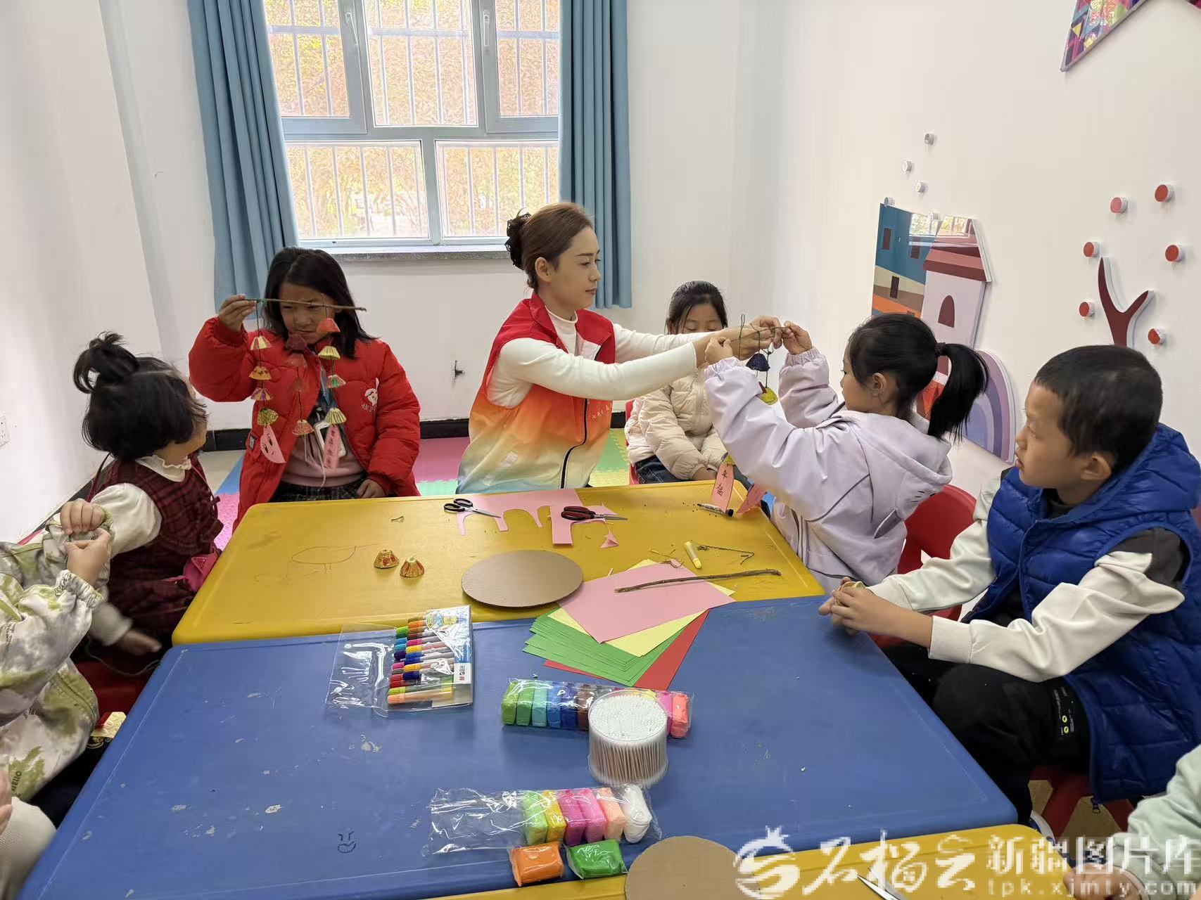 10月18日,育才路社区“七色光”志愿服务队的志愿者玛依热·买合木提(中间)正在教孩子们手工制作。天山网-新疆日报记者 白素君摄