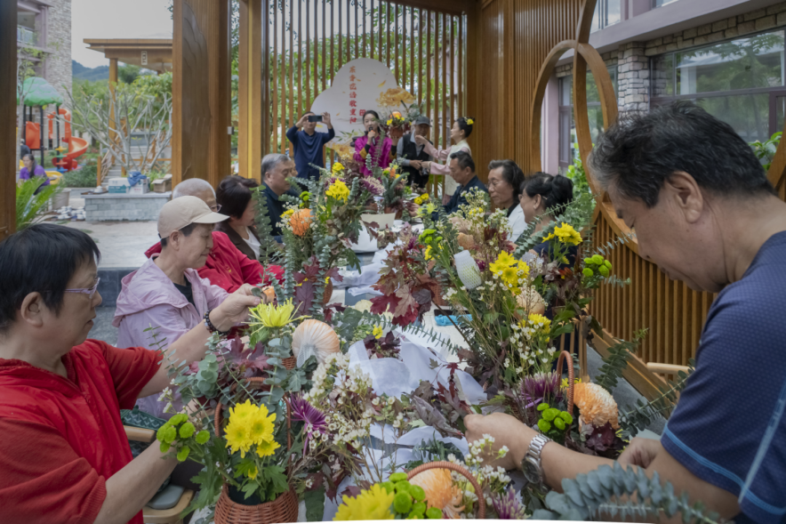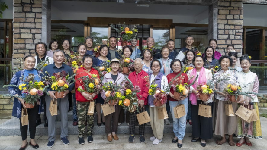 随后的“茶香花韵暖时光”体验环节中,嘉宾们在专业老师指导下,品鉴桂花红茶,学习冲泡技巧,并搭配重阳茶点,感受“茶香暖秋”的闲适雅意。花艺手作环节同样温馨有序,大家选用牡丹菊、红枫、腊梅等花材,精心制作“重阳花礼”,现场洋溢着浓浓的温情。