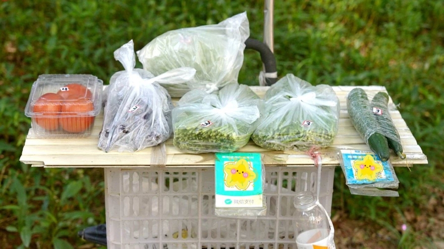 清晨的阳光洒在清远市清新区龙颈镇金碧社区的步道上,十几个菜摊悄然摆开,青菜瓜果水灵鲜嫩,每把蔬菜都系着标价的纸条,旁边放着二维码和塑料零钱瓶。这里没有摊主看守,没有监控设备,交易全凭自觉。