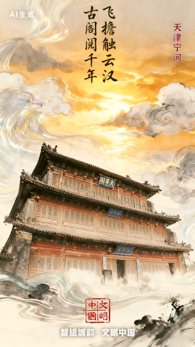 文明中国·天津|“智绘城韵·文明中国”海报:飞檐触云汉 古阁阅千年-新华网