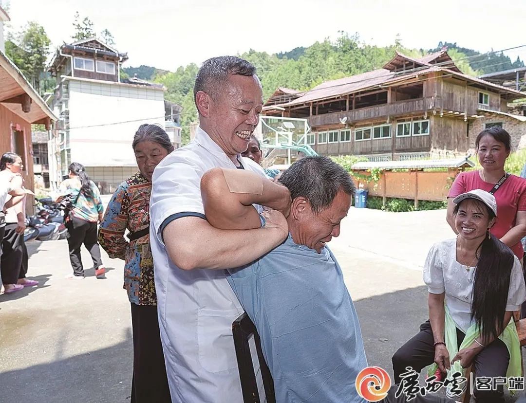 “八桂军号”老军医卫生健康服务队队员胡怀树为村民正骨。
