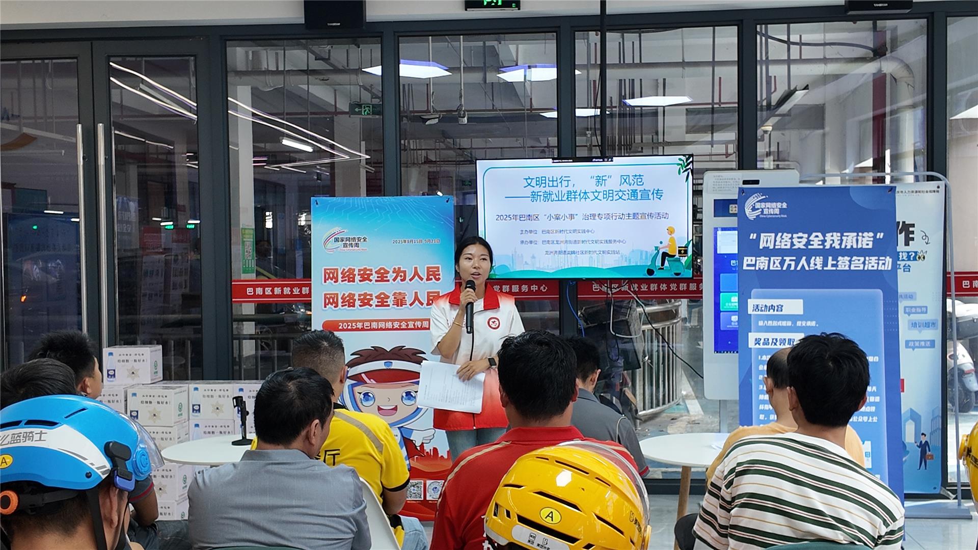 为深入推进全国文明城区创建,推动“小案小事”治理工作走进社区、贴近群众,提升新就业群体的交通安全意识和文明素养,9月18日,区新时代文明实践中心联合龙洲湾街道龙锦社区新时代文明实践站,在区新就业群体党群服务中心举办“文明出行,‘新’风范”——新就业群体文明交通宣传主题活动。