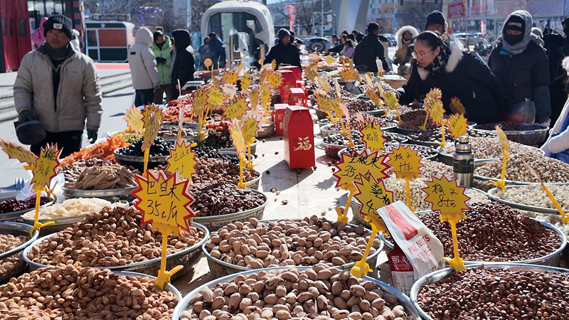 步行街干果摊位上,市民在挑选年货。新华网 刘娜 摄