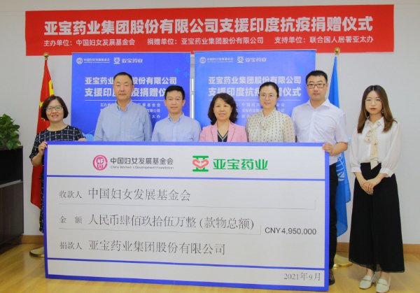 9月14日,由中国妇女发展基金会主办、联合国人居署亚太办支持的“亚宝药业集团股份有限公司支援印度抗疫捐赠仪式”在联合国人居署中国办事处举行。会上,亚宝药业向中国妇女发展基金会捐赠了总价值495万元人民币的30台呼吸机,用于支持印度抗击疫情。联合国人居署中国办公室项目主任张振山、中国妇女发展基金会副理事长兼秘书长张建岷、中国妇女发展基金会助理秘书长南静与亚宝药业总裁任伟出席了捐赠仪式。
