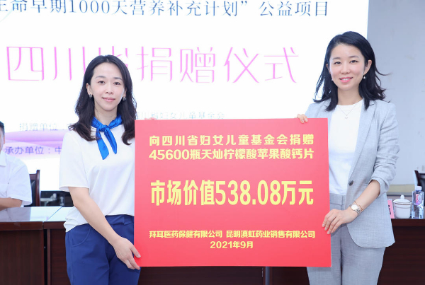 顾晓娟(右)代表拜耳向王洁琼(左)及四川省妇女儿童基金会捐赠了营养补充剂
