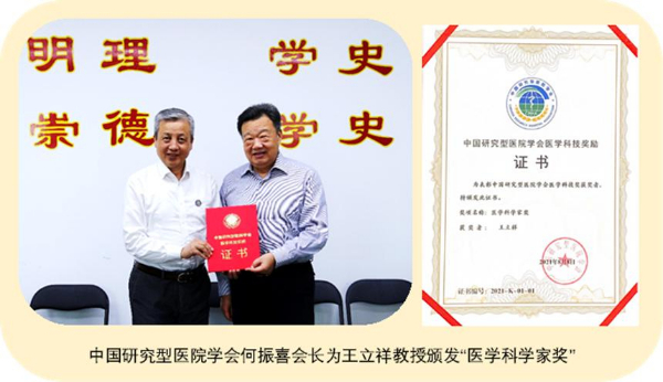 在2021中国研究型医院高峰论坛大会上,对在医学研究和创新实践工作中做出突出贡献的科技人员及创新项目进行了表彰,中国研究型医院学会心肺复苏学专业委员会主任委员王立祥教授荣获“医学科学家奖”。