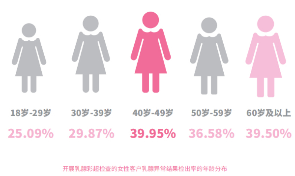 乳腺异常的年龄分布数据显示:40岁-49岁女性客户乳腺异常检出率最高,为39.95%,往下依次为60岁及以上、50岁-59岁、30岁-39岁和18岁-29岁。