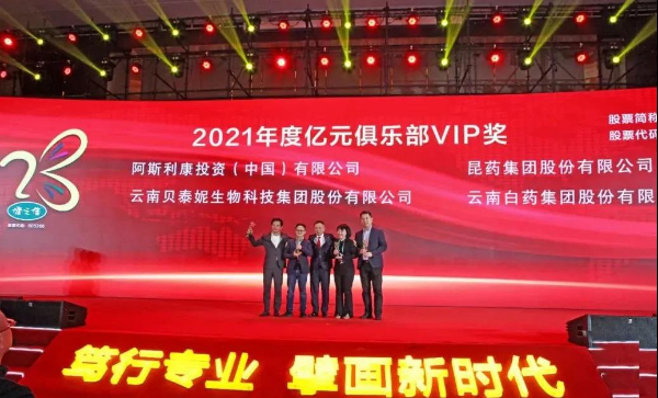 12月8日,“笃行专业、擘画新时代”健之佳主板上市周年庆典暨2021年供应商联谊会在昆明洲际酒店举行,昆药集团总裁钟祥刚率营销中心团队应邀出席盛会并进行主题分享,同时昆药集团作为全品类第一进入健之佳亿元俱乐部并荣获VIP奖。