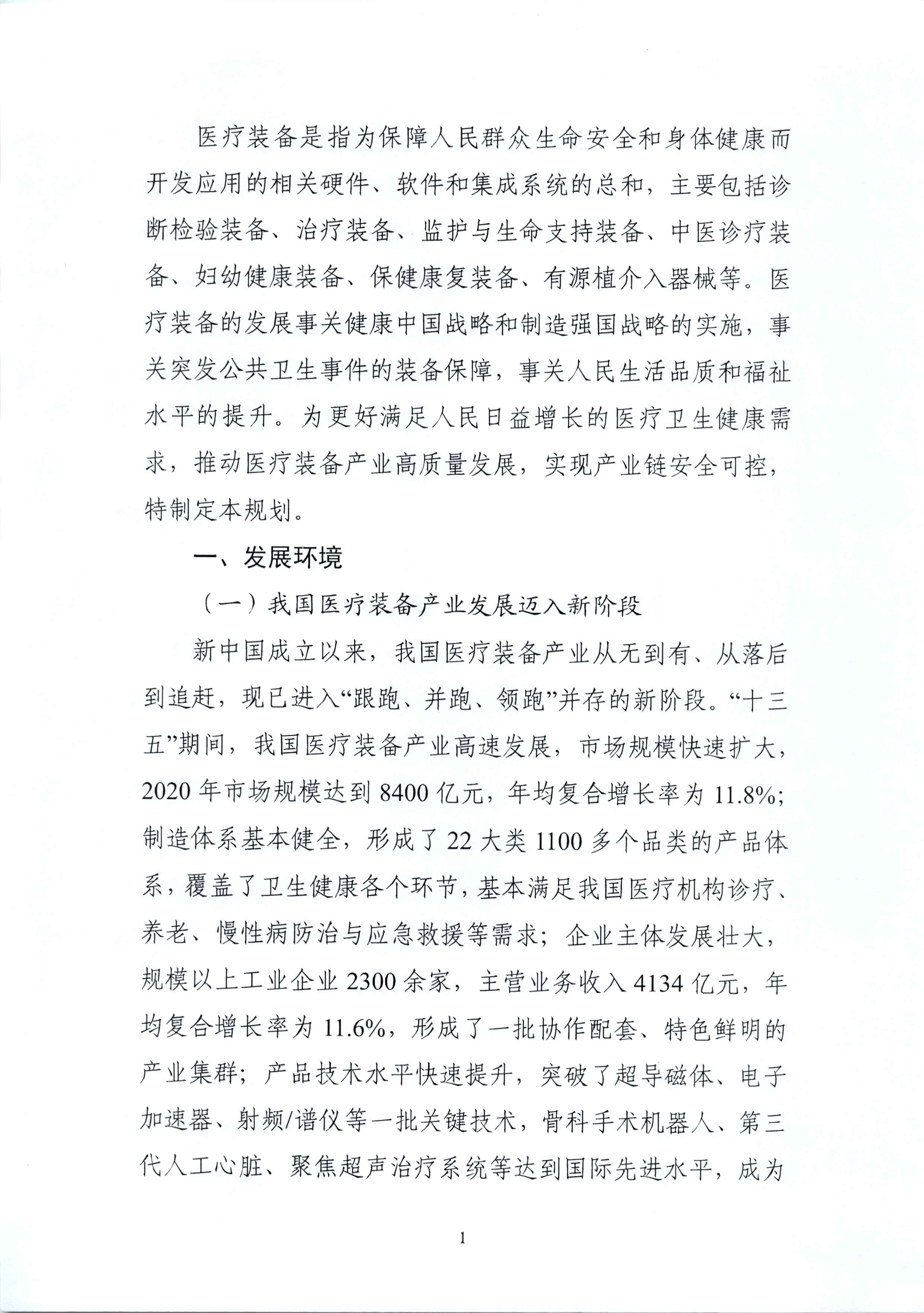 日前,工业和信息化部、国家卫生健康委员会等是部门联合印发了《“十四五”医疗装备产业发展规划》,具体内容如下: