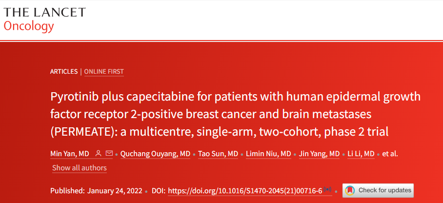 1月25日,由河南省肿瘤医院闫敏教授牵头的吡咯替尼联合卡培他滨治疗HER2阳性乳腺癌脑转移的研究成果正式全文在线发表于国际权威医学期刊《柳叶刀.肿瘤》。该研究结果显示吡咯替尼联合卡培他滨对颅内、外病灶均能有效抑制,尤其是既往未经治疗的脑转移患者获益明显。