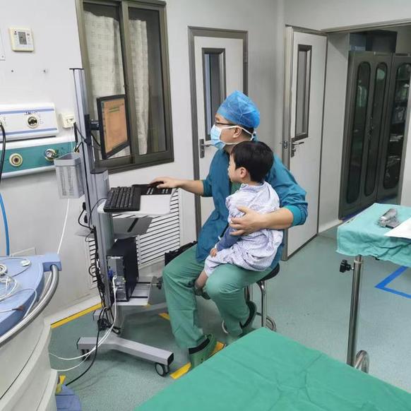 麻醉手术科医生像对待自己的孩子一样,用电脑动画片逗患儿开心,稳定其情绪,完成手术。