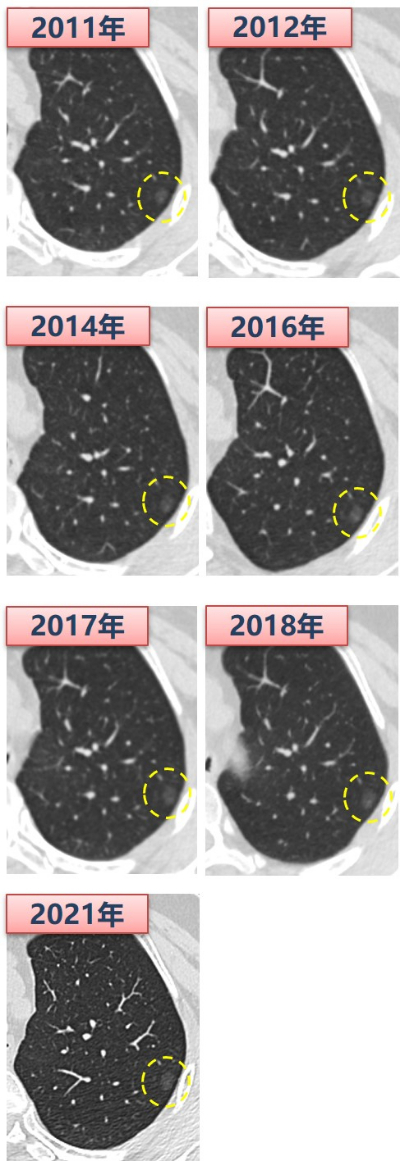 结合一个长期随访的病例来告诉大家。这个病人在2011年发现了左肺上叶的一个小的纯磨玻璃结节,直径约7mm。因为结节比较小、密度也比较淡,病人心态也比较好,接受了随访观察这个策略。此后逐年复查发现这个GGO都很稳定,直到10年后的今天,结节仍然稳定,并没有明显的直径增长或者实性成分增加(图一)。这个病人在这10年中只需要每年接受一次胸部CT平扫,并不需要承受胸部微创手术的创伤、风险和并发症。多项大型GGO长期随访研究证实,纯GGO随访中增长的比例仅为5%-10%,仅占很少数,大部分纯GGO是保持不变的。当然,混合密度GGO增长的比例要明显增高,随访策略也不同。
