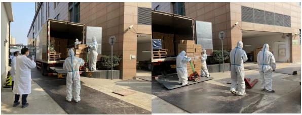 3月12日,上药余天成(上海)医药有限公司余天成堂接到了来自隔离学校的隔离服等防疫物资申购清单后,余天成堂立即联系业务仓储,分部门调度筹备物资,在任务重、人员紧的情况下,连锁、批发驻守干部纷纷上阵搬运、转运,及时将货物运送到了隔离点。