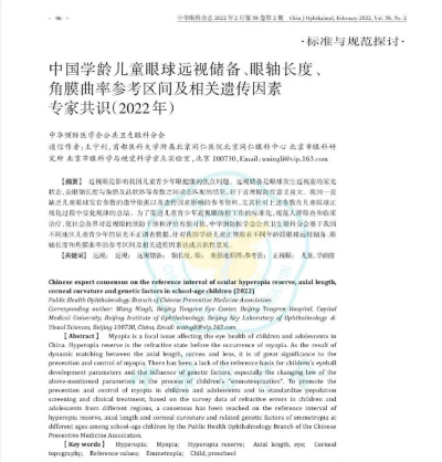 儿童眼球和视力是逐步发育成熟的,新生儿的眼球较小,眼轴较短,随着儿童生长发育,眼球逐渐由小向大增长,眼轴随之变长,眼屈光度数逐渐趋向于正视。在眼球发育过程中,远视储备应该在正常的范围,远视储备超过相应年龄的上限,则应注意儿童是否患有远视眼及远视性弱视;远视储备低于相应年龄的下限,即远视储备不足,则可能导致近视。因此,需要明确中国学龄儿童远视储备的参考区间。
