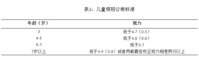 需要强调的是,在儿童眼球发育过程中,视力和屈光度的发育是相互匹配的。如果远视储备在正常范围内,还应关注儿童的视力情况,如果视力低于正常年龄范围,应注意儿童是否患有弱视(表2)。
