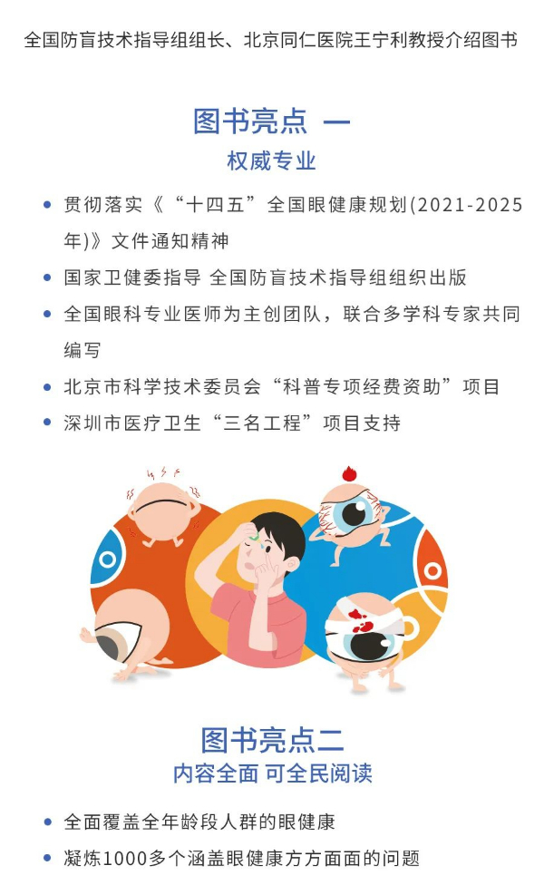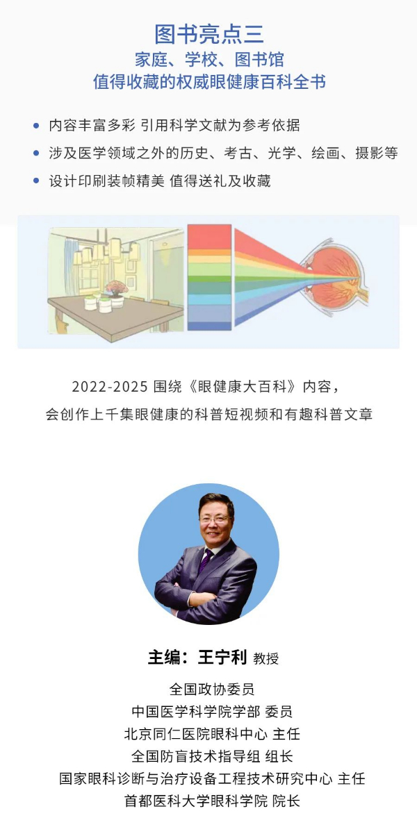为进一步落实眼健康科普传播工作,普及权威、正确的眼健康知识,提高公众对眼健康的重视度和关注度,增强全社会眼病防治意识,有效减少、控制视力残疾的发生,改善目前国人眼健康水平差、眼科学普及知识知晓率低的现状,推动推进我国眼健康事业高质量发展。在国家卫健委医政医管局统一部署下、在全国防盲技术指导组的指导下,全国防盲技术指导组组长、北京同仁医院王宁利教授集合全国眼科专业医师主创团队同时联合多学科专家,近百位创作者、历时4年余编写完成《眼健康大百科(全四册)》科普著作。