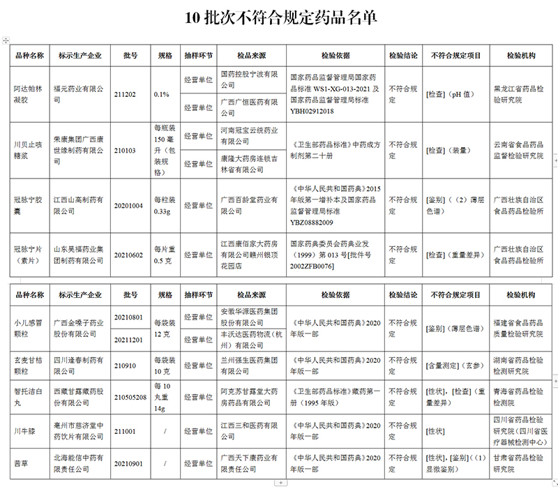 经福建省食品药品质量检验研究院等8家药品检验机构检验,标示为广西金嗓子药业股份有限公司等9家企业生产的小儿感冒颗粒等10批次药品不符合规定。现将相关情况通告如下: