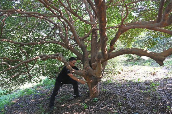进入古油茶园,高大的油茶树遮天蔽日,连成一片。树冠直径超过5米的高龄油茶树,一棵挨着一棵,攒着劲比着长。一树浓荫,一树硕果。攀上山脊,新开的几块茶园边上的高龄油茶树,更是被满树茶果压弯了枝头。