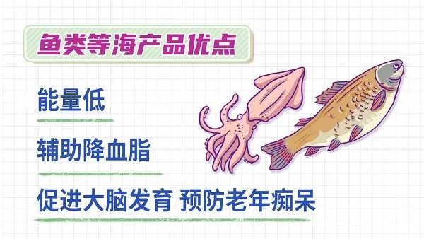 除此之外,我们还可以用鱼虾等海产品来代替一部分红、白肉。不仅能量更低,其中的EPA能辅助降血脂,DHA还能促进大脑发育和预防老年痴呆。