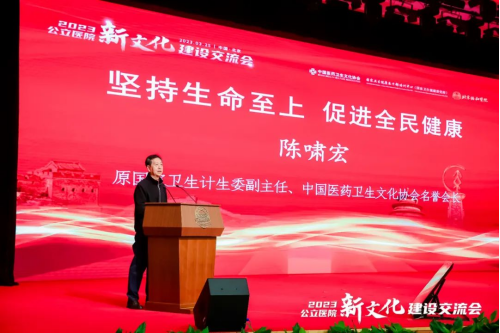 原国家卫生计生委副主任、中国医药卫生文化协会名誉会长陈啸宏,国家卫生健康委医政司医疗资源处副处长高勇,国家卫生健康委干部培训中心(国家卫生健康委党校)党委书记、副主任(副校长)周美林分别以《坚持生命至上促进全民健康》《公立医院高质量发展与新文化建设》《党建引领公立医院新文化建设》为题作主旨演讲。