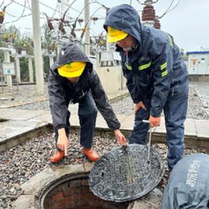 国网天津电力工作人员对变电站设备排水情况及防汛设施开展特巡。(新华社发 杨培斌摄)
