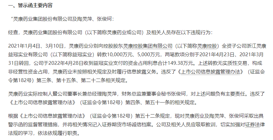 上述转款无实质性交易,构成非经营性资金占用,灵康药业未按照相关规定及时履行信息披露义务。违反相关规定。灵康药业实际控制人暨公司董事长兼总经理陶灵萍,财务总监兼董事会秘书张俊珂,对上述问题负有主要责任,因而对陶灵萍、张俊珂采取出具警示函的监督管理措施,并将相关情况记入证券期货市场诚信档案。