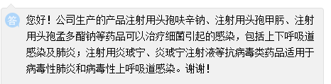 日前,灵康药业在互动平台表示,公司生产的产品注射用头孢呋辛钠、注射用头孢甲肟、注射用头孢孟多酯钠等药品可以治疗细菌引起的感染;注射用炎琥宁、炎琥宁注射液等抗病毒类药品适用于病毒性肺炎和病毒性上呼吸道感染。