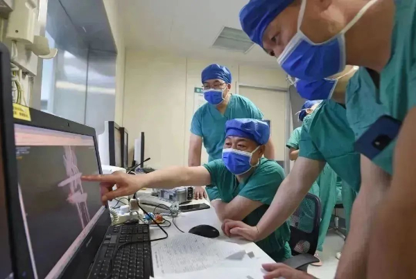 这一涉及到影像诊断手段和介入治疗的复杂性外科手术,需要在先进的杂交手术室才能开展。接到通知后,手术室在最短时间内安排好场地。输血科第一时间协调备血,紧急调动血库大量用血准备,确保患者用血安全。