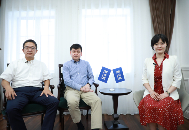 余宏杰(左)、张文宏(中)接受新华网专访