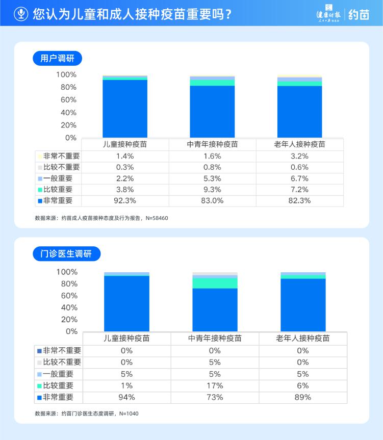 据悉,《成人疫苗接种态度及行为报告》(以下简称《报告》)基于约苗平台4000余万用户及8000+门诊医生进行全面调研,多维度分析约苗平台用户对成人疫苗的认知态度、接种行为,接种服务需求等,以期为行业发展提供参考。
