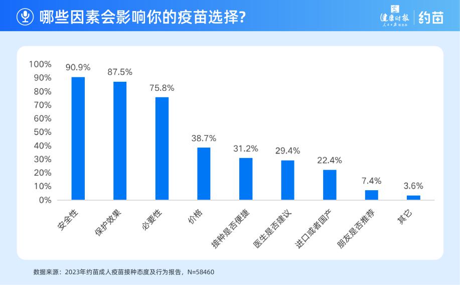 此外,《报告》显示,“安全性、保护效果、必要性”是大众接种疫苗时考虑的三个重要因素,占比分别为90.9%、87.5%、75.8%。因部分成人疫苗需要自费接种,38.7%的人在选择疫苗时会受价格因素影响。