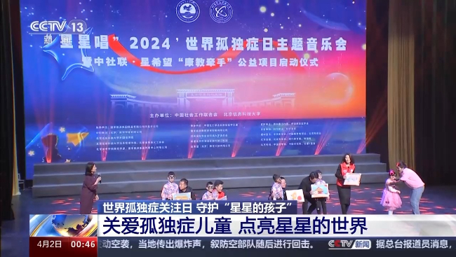 在北京,世界孤独症关注日主题活动在北京信息科技大学举行。大学生“康复义工服务队”的志愿者与30多名孤独症儿童一起同台演出,孩子们表演了颇有童趣的《小花朵与最靓的仔》 ,与志愿者共同完成歌曲《童年》的弹唱。孩子们向志愿者赠送了自己的画作。当天还启动了“星希望”康复教育牵手计划项目,中国社会工作联合会将联合社会力量,支持欠发达地区培养儿童康复人员,提升基层服务机构和残障家庭的照护能力。