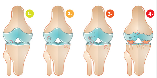 随着骨性关节炎病程不断延长,关节软骨基质不断脱落,各种炎症因子持续释放,原本清澈透明的关节滑液逐渐充满炎症因子,变成了污浊不堪的“脏水池”。此时,已出现磨损的关节软骨,及其周围的组织结构,将无一例外地受到充满炎症的关节滑液“脏水池”的侵蚀,最终导致磨损的关节软骨逐渐失去光滑表面,甚至出现大面积缺损;软骨下骨硬化,关节边缘骨质增生形成骨赘。关节活动时不再有“丝滑”感,软骨的局部缺损,使软骨下骨中的痛觉神经纤维暴露在充分炎症因子的“脏”的关节滑液中,疼痛也伴随而来。