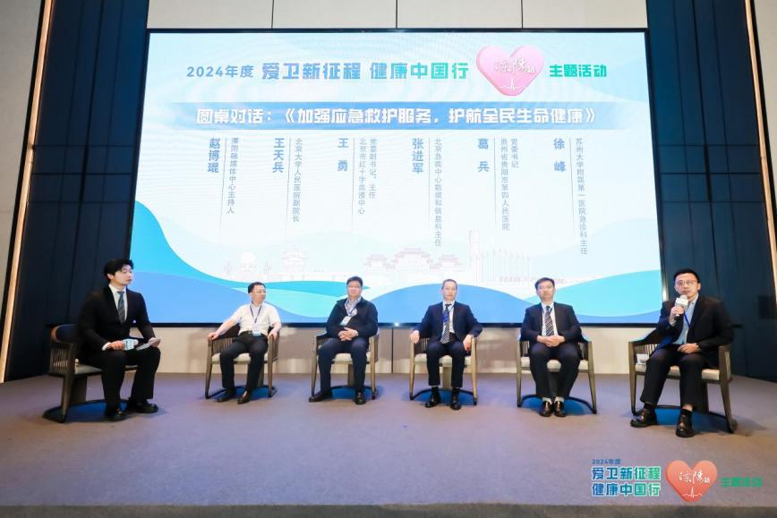 在活动第二篇章“救在身边·多维分享”中,北京大学人民医院副院长王天兵,北京市红十字血液中心党委副书记、主任王勇,北京急救中心数据和信息科主任张进军,贵州省贵阳市第四人民医院党委书记葛兵,苏州大学附属第一医院急诊科主任徐峰共同围绕“加强应急救护服务,护航全民生命健康”圆桌对话主题展开深度交流。