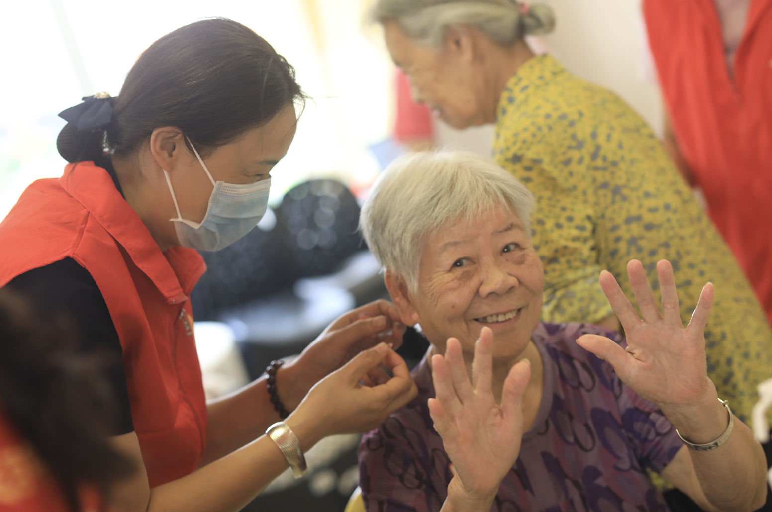 黄雪芳作为志愿者关爱银发长者健康,参加耳穴义诊活动