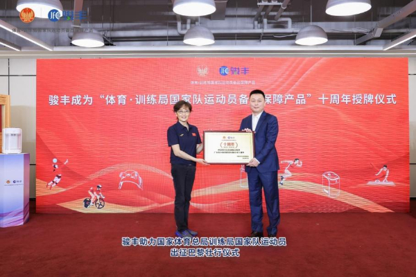 据悉,今年是骏丰公司与国家体育总局训练局合作十周年,国家体育总局训练局副局长周秋瑞现场为骏丰公司颁发十周年合作牌匾。