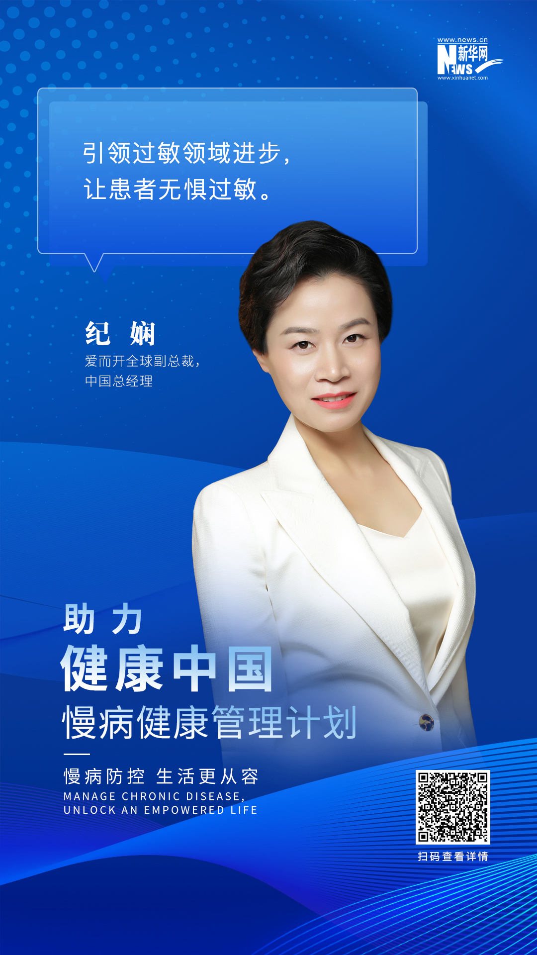 新华网北京8月5日电(白碧璇)8月2日,由中国外商投资企业协会药品研制和开发工作委员会(RDPAC)主办,新华网支持的“慢病防控 生活更从容助力健康中国·慢病健康管理计划”活动在北京举行。爱而开全球副总裁、中国总经理纪娴在接受新华网采访时表示,慢性病已成为全球重大公共卫生问题,爱而开致力于为患者提供对因治疗方案,同时加速引进和研发新的特异性免疫治疗产品,以满足中国患者的临床需求。